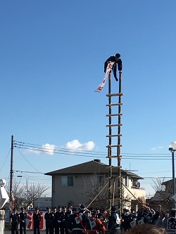 【落合】 はい。加須鳶組合に入っています。本来は鳶職専門の会なのですが、伝統を繋いでいくために会を作っているのですが、人数不足もあり私の義理の弟が加須の鳶組合に在籍していたこともあり声をかけられました。彼は私が中学時代に体操部だったということを知っていたので、それだけで梯子とかに乗れるのではないかと言われて、それがきっかけで鳶組合に加入して現在まで活動しています。体操部のことですが、実は一年間しかやっていなかったのですが。(笑)それから、かれこれ加入して12年~13年になりますが、鳶組合でのデビューは40歳で梯子乗りとしてはかなり遅い方でした。鳶としてのお披露目は加須の出初式やお祭りでしていました。私は46歳くらいまで梯子に乗っていて、それ以降は若い世代に譲りました。